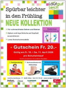 Spürbar leichter in den Frühling – die neue Kollektion bei Laufgut Lerch Der Frühling ist da – und mit ihm die Lust auf Bewegung, Spaziergänge und aktive Tage. Damit jeder Schritt Freude bereitet, präsentiert Laufgut Lerch in Olten die neue Frühjahrskollektion an bequemen, funktionellen und hochwertigen Schuhen. Jetzt ist der ideale Zeitpunkt, um den Füssen